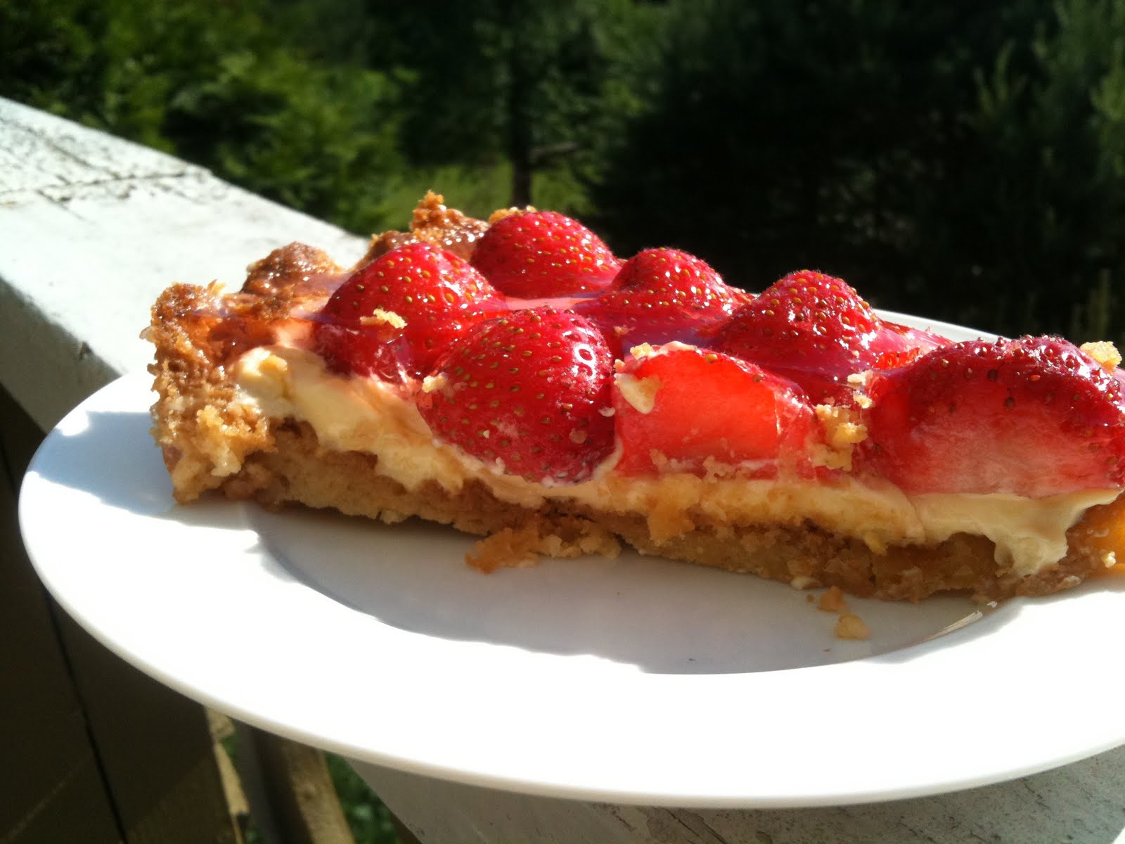 Dekk den avkjølte kaken med vaniljekrem og legg utover de delte jordbærene.